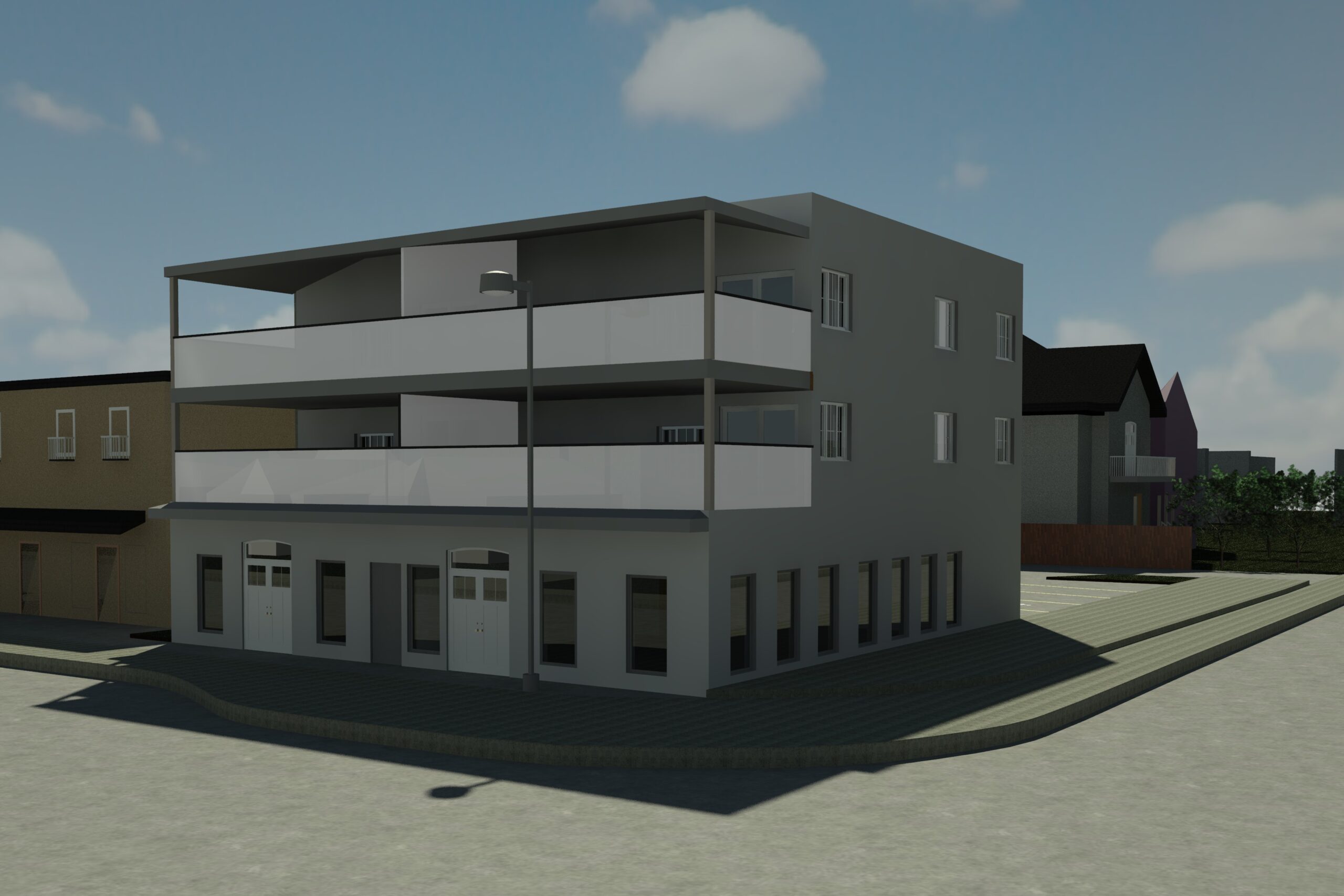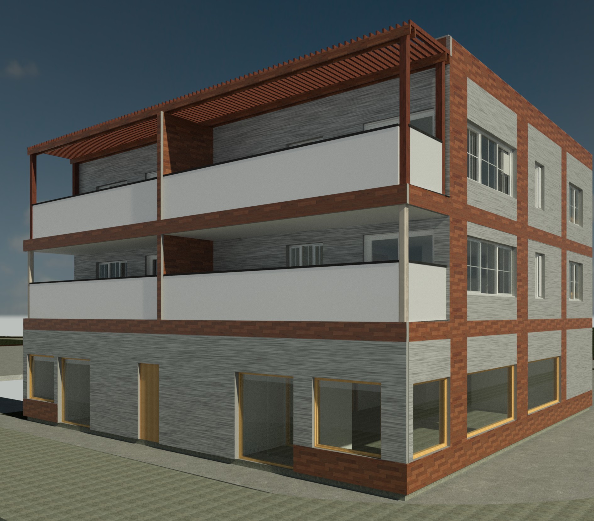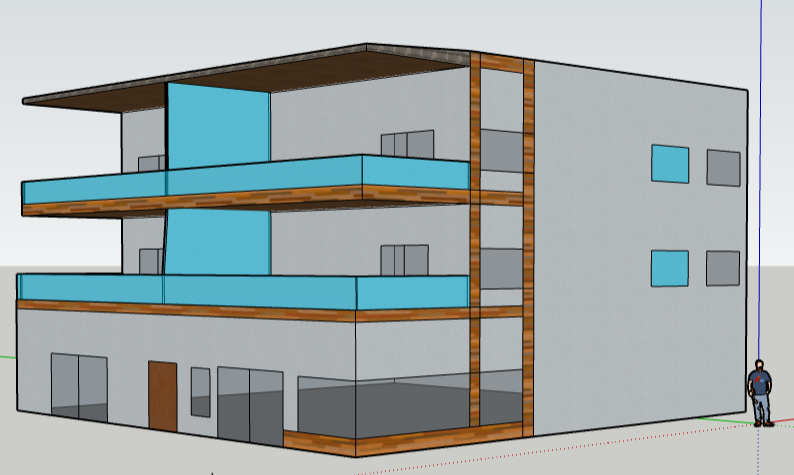 As I worked on the facade design, I looked at the surrounding buildings along 19th Street. Many used aluminium panels and wood, so I changed the facade design from solid aluminum composite panels to incorporate wood composite panels, dividing my design and improving the look of the facade. During my first draft of the building I had incorporated a roof above the balconies but to match the design of the facade, I added a wooden pergola.