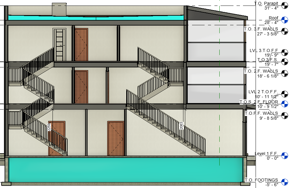 As I remade the project for interim report three, I focused on changing dimensions to allow for a slightly larger parking lot and residential units. By reducing the size of the main floor I was able to align the vestibules with the wall behind the roof decks, reducing the size of the roof decks but increasing the size of the units. This allowed me to add hidden columns within the vestibules, supporting the upper floors and removing wasted space in the commercial units. Then while working on my joist layout, I made the walls surrounding the staircase structural and slightly reduced the width of the building allowing for all I-joists to stay under 20 feet.